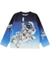 Mountoo is a long sleeve blue t-shirt with a print of flying astronauts on the front, back and sleeves.
